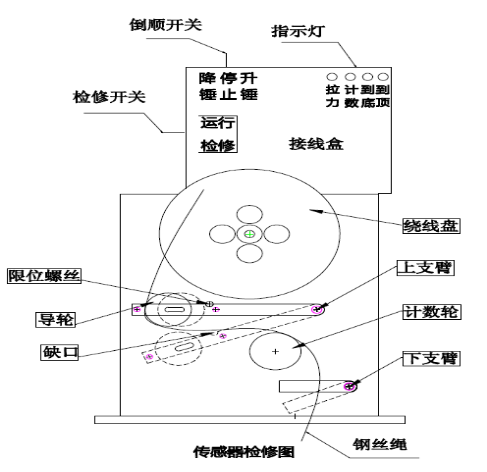 **后檢查一下導輪、計數輪轉動是否靈活,上支臂水平時,缺口要和限位螺絲剛好吻合。檢修完畢,將“倒順開關”撥到“升錘”,繞線盤順時針旋轉,直到重錘上升到頂部,電機會自動斷電,此時將“倒順開關”撥回中間“!,再將“檢修開關”撥到“運行”,蓋上外殼。